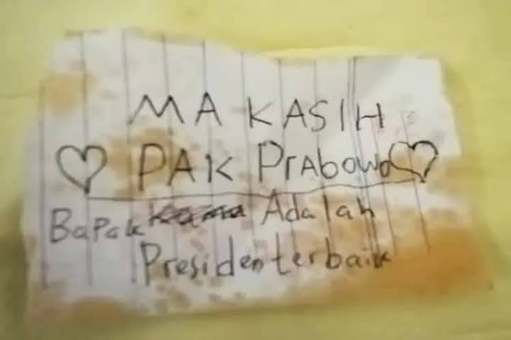 Dalam pesannya, sang anak menulis, “Makasih Pak Prabowo. Bapak adalah presiden terbaik,” yang dihiasi dengan gambar hati.