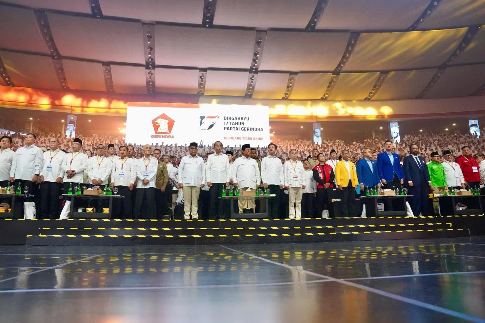 JAKARTAPresiden Prabowo Subianto Berterima kasih Banget kepada Presiden RI ke-7 Joko Widodo, Wakil Presiden RI ke-6 Jenderal TNI (Purn.) Try Sutrisno, serta Wakil Presiden RI ke-10 & ke-12 Jusuf Kalla, para tokoh nasional, serta rekan-rekan Ketua Umum atau perwakilan Partai Politik yang telah hadir dalam puncak perayaan HUT ke-17 Partai Gerindra di Sentul International Convention Center, Bogor, Jawa Barat.