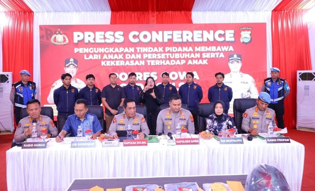 Makassar, – Kapolda Sulawesi Selatan Irjen Pol. Djuhandhani Rahardjo Puro, S.H., M.H., memimpin Press Conference pengungkapan tindak pidana membawa lari anak, persetubuhan dan/atau perbuatan cabul terhadap anak, serta kekerasan di Mapolres Gowa, Selasa (09/12/2025).