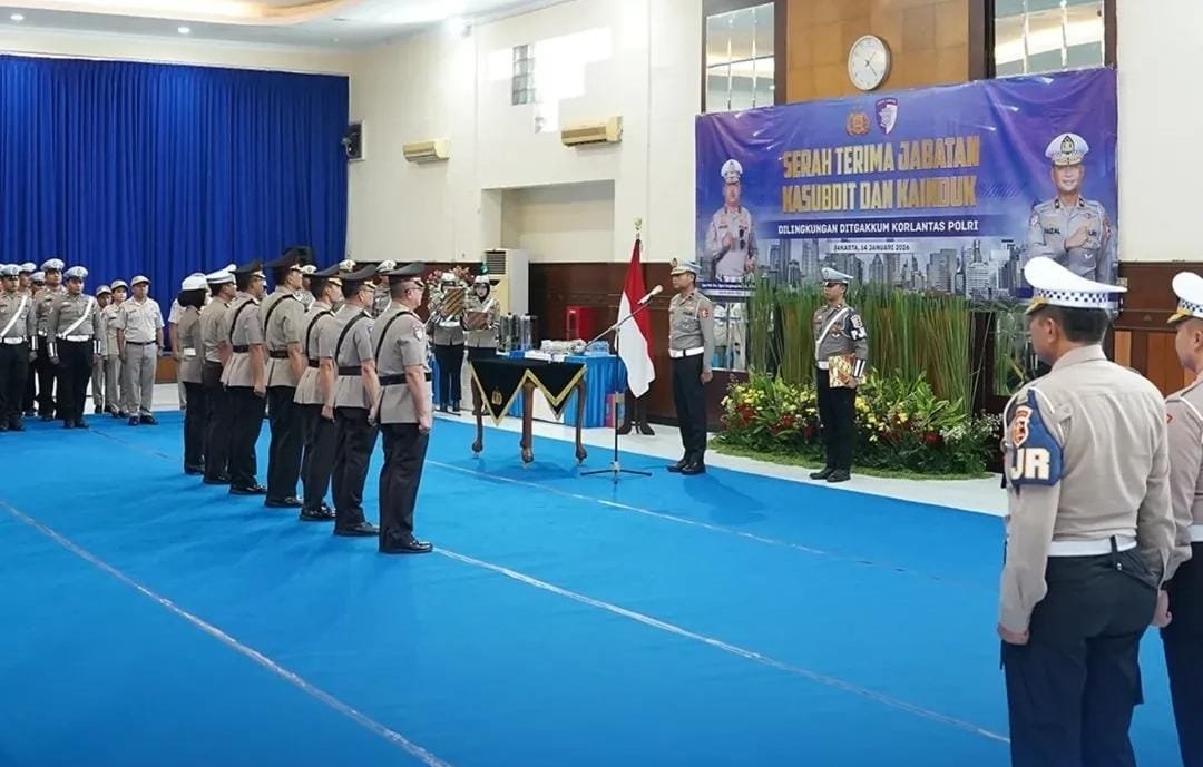 Jakarta – Korps Lalu Lintas (Korlantas) Polri menggelar upacara serah terima jabatan (sertijab) sejumlah pejabat di lingkungan Direktorat Penegakan Hukum (Ditgakkum). Kegiatan berlangsung di Aula H.S. Djayusman Korlantas Polri, Jakarta, Rabu (14/1/2026).