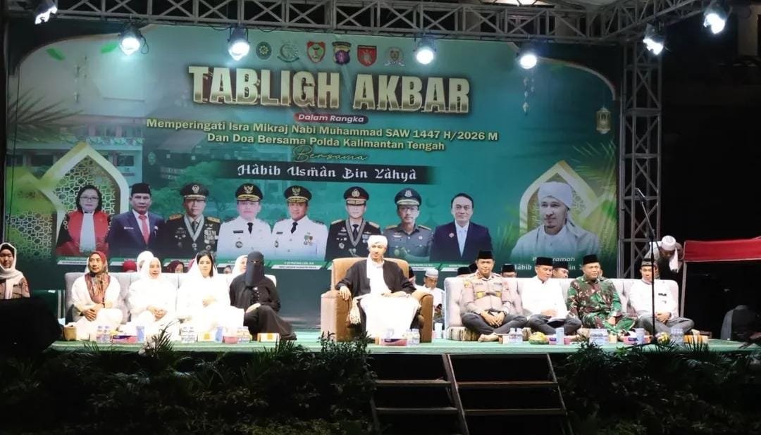 Palangka Raya — Nuansa religius dan kebersamaan menyelimuti Lapangan Barigas, Mapolda Kalimantan Tengah, saat ribuan jemaah berkumpul menghadiri Tabligh Akbar dalam rangka memperingati Isra Miraj Nabi Muhammad SAW 1447 Hijriah, Kamis (23/1/2026) malam.