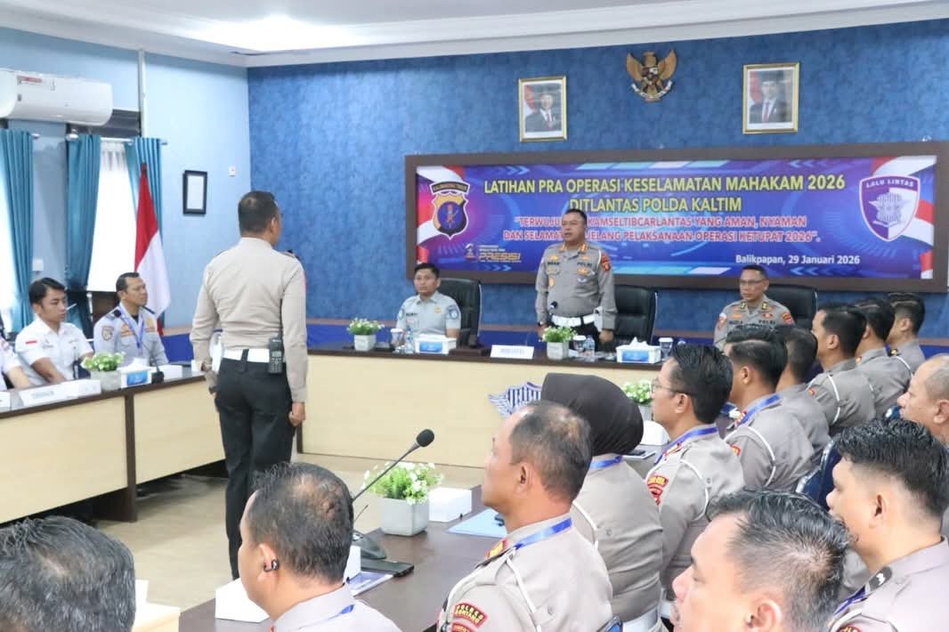 Balikpapan – Kepolisian Daerah Kalimantan Timur menggelar Latihan Pra Operasi (Latpraops) Keselamatan Mahakam 2026 sebagai bentuk kesiapan menjelang pelaksanaan operasi kepolisian di bidang lalu lintas. Kegiatan tersebut berlangsung di Aula Mako Direktorat Lalu Lintas Polda Kaltim, Jumat (30/01/26).