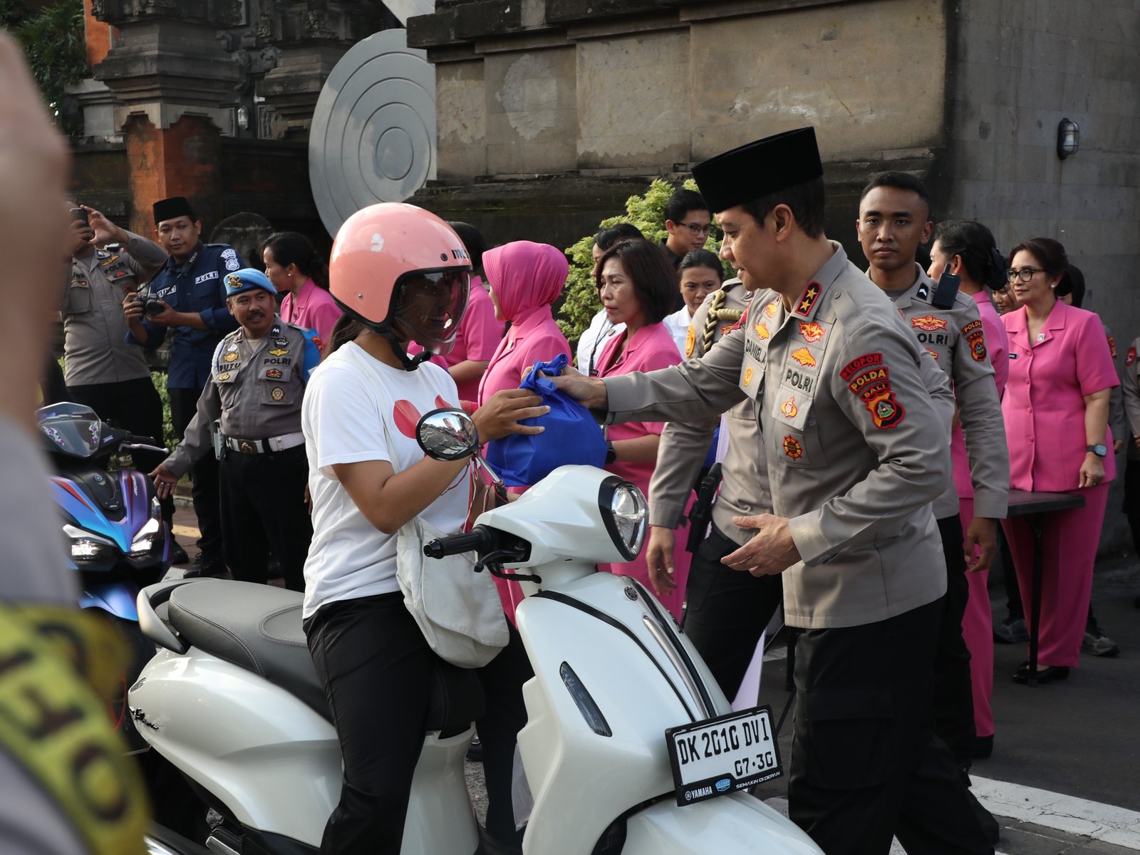 Denpasar, – Kapolda Bali Irjen Pol. Daniel Adityajaya, S.H., S.I.K., M.Si., didampingi Wakapolda Bali Brigjen Pol. I Made Astawa, S.I.K., bersama Ketua Bhayangkari Daerah Bali Ny. Didit Daniel Adityajaya dan Wakil Ketua Bhayangkari Daerah Bali Ny. Silvia Made Astawa, serta para Pejabat Utama. Polda Bali melaksanakan kegiatan berbagi takjil kepada masyarakat di halaman depan Mapolda Bali.