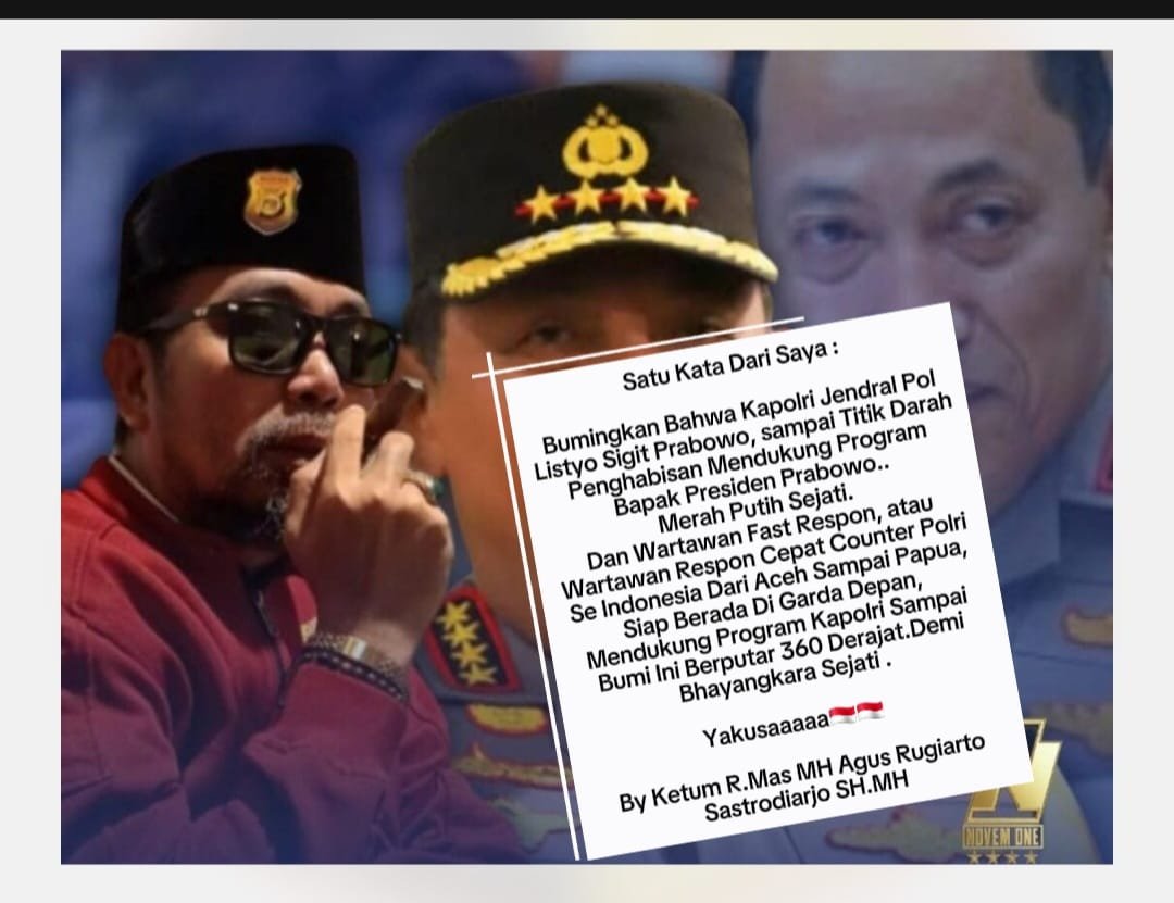 Jakarta, – Komitmen kuat dalam mendukung arah kebijakan nasional kembali ditegaskan oleh jajaran Wartawan Fast Respon di seluruh Indonesia. Dalam pernyataan tegasnya, Ketua Umum Fast Respon, R. Mas MH Agus Rugiarto Sastrodiarjo, SH., MH., menyerukan semangat totalitas kepada seluruh elemen wartawan untuk berdiri di garis terdepan mengawal kinerja Kapolri Jenderal Polisi. Listyo Sigit Prabowo.