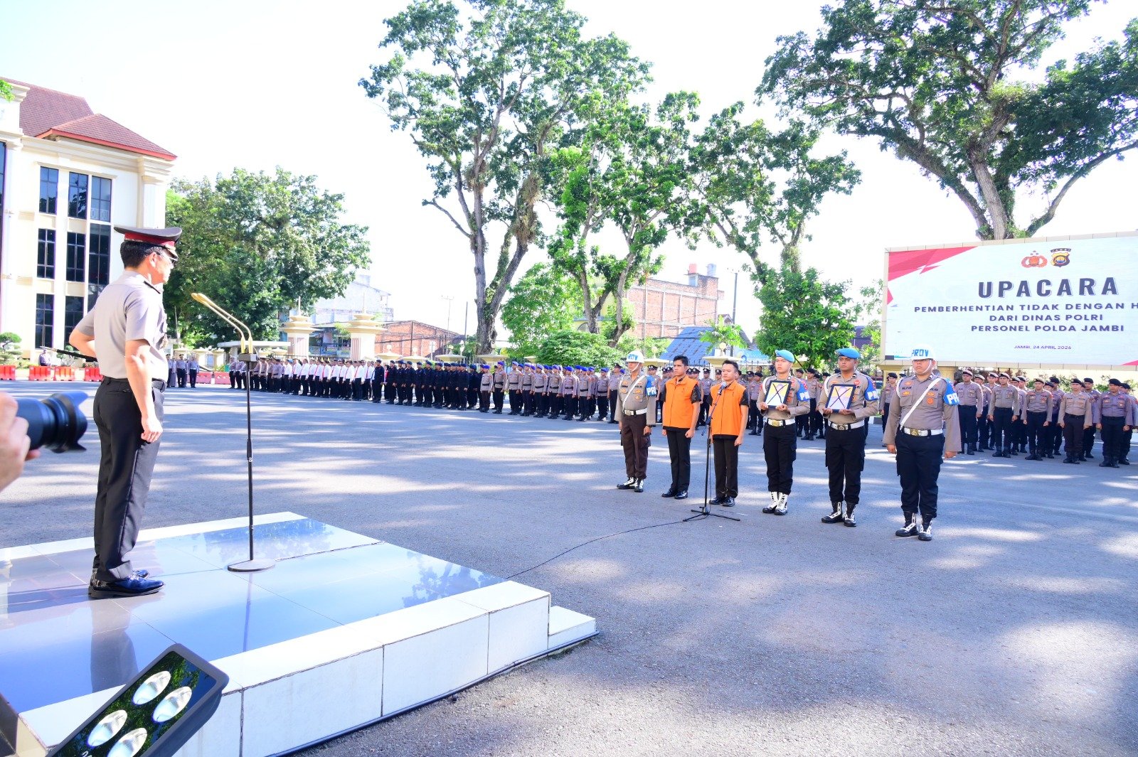Jambi, – Polda Jambi menggelar Upacara Pemberhentian Tidak Dengan Hormat (PTDH) terhadap empat personel yang terbukti melakukan pelanggaran Kode Etik Profesi Polri, Jumat (24/4/2026).